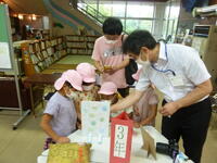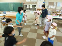校区内の幼稚園年長さんがプールの交流会に来ました。せっかく来たのに雨で入れず、作品展示を見て、急遽