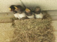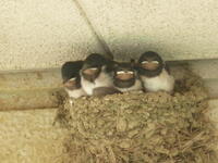 本校の軒下にツバメの巣がありますが、この時期になっても巣立っていかないツバメたちが、巣から顔をのぞかせていました。