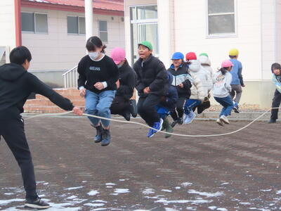 縄跳びでは、主に大縄跳びの練習に励んでいます。上級生が下級生の手をひいて優しくサポートしています。チームワーク抜群です。