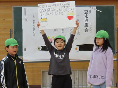 そして、全員で「追い出したいオニ」を発表しました。きっと、弥栄小の子どもたちの元気いっぱいな姿に、オニも恐れをなして逃げたことでしょう!