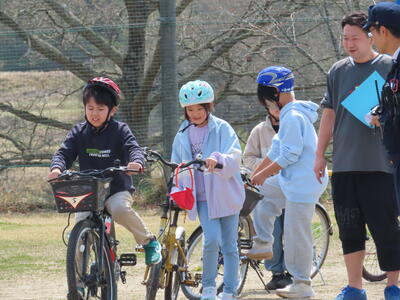 中・高学年は校庭の特設コースで自転車の乗り方を練習し、3年生はジグザグ走行などで技術を磨き、5・6年生は実際の道路で走行訓練に励みました。講評では「命を守るためのルール」の大切さを改めて教えていただきました。