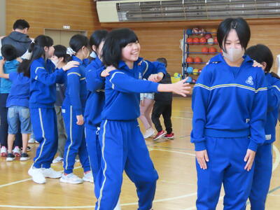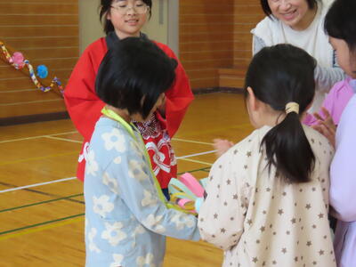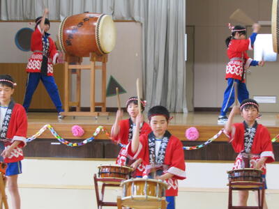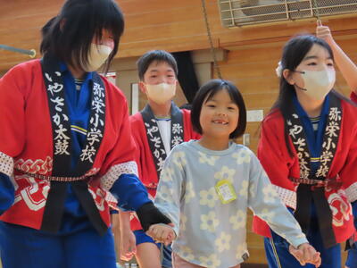 2年生からは、手作りした首飾りが贈られました。そして、ゲームタイムでは、「進化じゃんけん」や「じゃんけん列車」で大盛り上がり。学年を越えて31名全員が大きな一つの輪になり、体育館は笑顔と歓声に包まれました。さらに、5年生と6年生は、伝統の「いやさか太鼓」を披露しました。